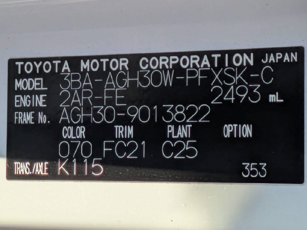 | 車名 | アルファード | 車台番号 | 822 |