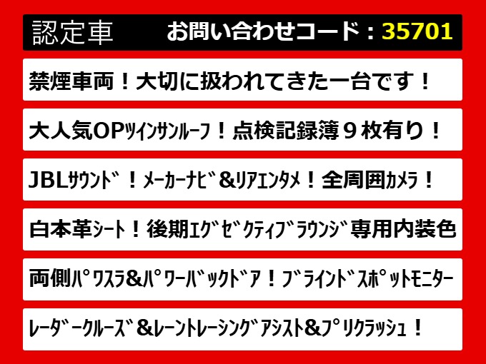 | グレード | ヴェルファイアHV EXラウンジZ サンルーフ JBL 白革 禁煙 | ||