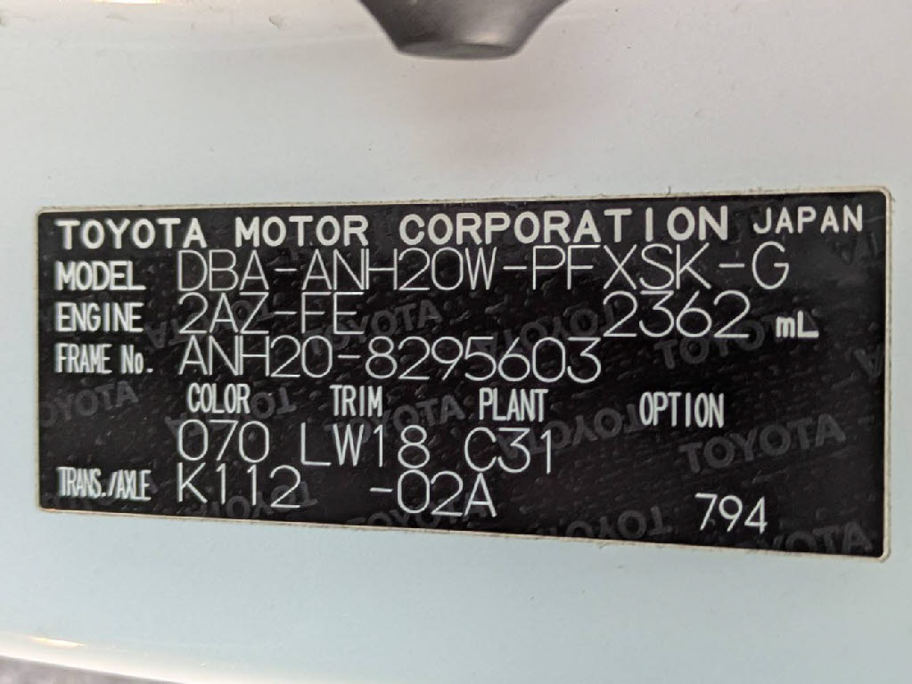 | 車名 | アルファード | 車台番号 | 603 |