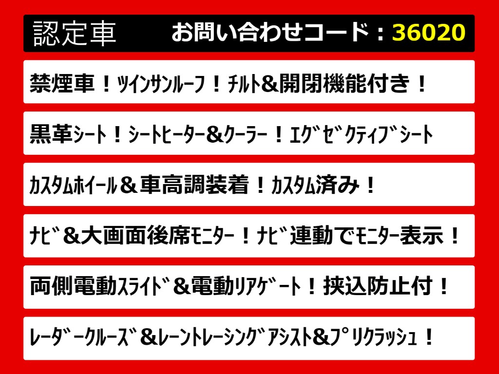 | グレード | ヴェルファイア 2.5Z-G サンルーフ 黒革 車高調 禁煙車 | ||